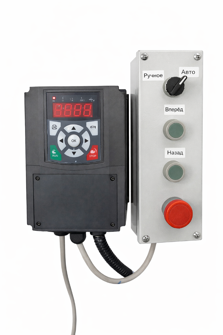 Автоматический блок управления оснащён двумя частотными преобразователями и позволяет гибко настраивать режимы работы скрепера. Доступно программирование от 48 до 96 циклов в сутки, задание точек остановки, настройка логики распознавания препятствий с автоматическим повторным запуском, а также регулировка расстояния возврата скрепера после столкновения.