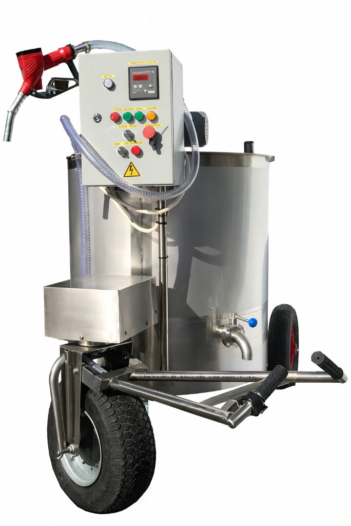3-х либо 4-х колесная база с большими колесами позволяет легко передвигать шатал, по желанию он может быть оборудован электрическим мотором (приводом 24V) на два колеса, и эргономической, регулируемой по высоте рукояткой. Рукоятка оборудована двумя независимыми лепестками управления – справа и слева. Это позволяет вам одинаково удобно управлять молочным такси и раздавать смесь как справа, так и слева, с возможностью плавного регулирования скорости движения. Направление движения вперед/назад. Расположение и размер колес, а так же расстояние между ними обеспечивают Шаттлу великолепную устойчивость при малом радиусе разворота. Один привод миксера позволяет, в зависимости от программы, как бережно перемешивать цельное молоко, так и мощно замешивать порошок ЗЦМ.